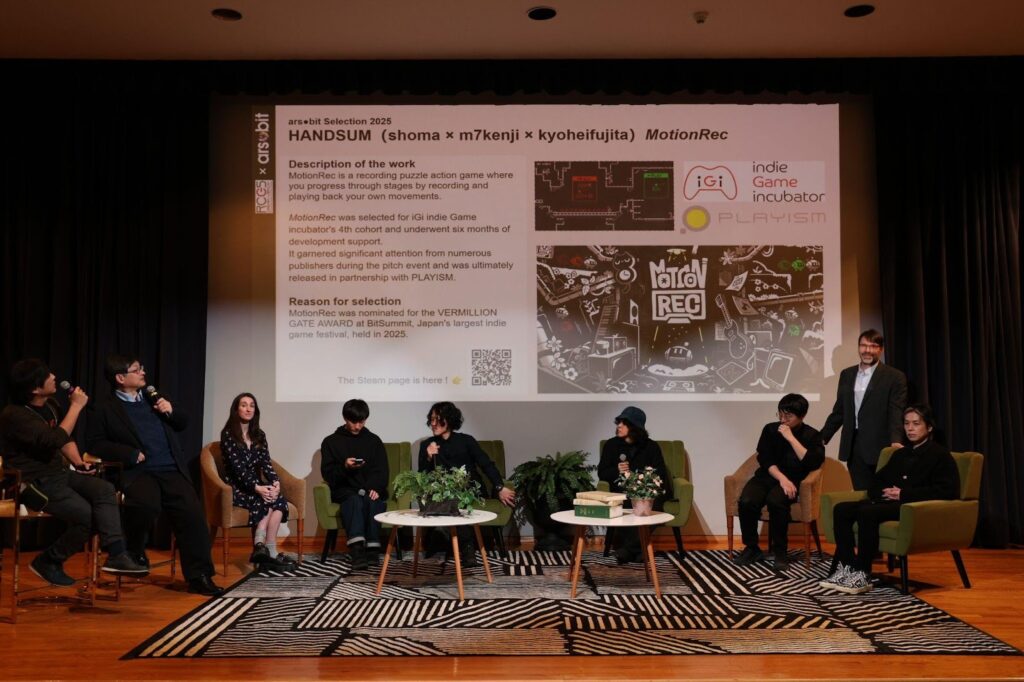 「ars●bitセレクション」の展示セクションでは、初年度(2025年度)の選定作品として、インディー系ディベロッパーのHANDSUM(ディレクター:shoma、グラフィック:m7kenji、コンポーザー:kyoheifujita)が開発した『MotionRec』がプレイアブル展示されています。